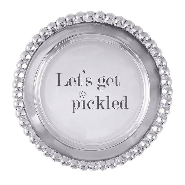 Main view Product Details Mariposa® LET'S GET PICKLED BEADED WINE PLATE by Mariposa® — Let's Get Pickled! Whether you are celebrating a win on the court or toasting a fellow pickleball partner the Let's Get Pickled Beaded Wine Plate serves as a cute resting place for your bottle. Shop the entire collection: Mariposa® Design Collection Important Note: Mariposa items are hand engraved. Your piece may differ slightly from the photo. LET'S GET PICKLED BEADED WINE PLATE by Mariposa® Mariposa® WINTER CELEBRATION Savings - Buy More / Save More * Add this item to your cart for the full details of this promotion. Conditions may apply. Model #808813192338 List $48.00 You pay $44.95 In stock Ships next business day [?] Your Price Match is Active Your request for a price of $0.00 for a minimum quantity of has been accepted. You have [time] left to purchase this item for $0.00 instead of $44.95 each. Find a Lower Price? We BEAT All Authorized Retailers [?] FEATURESMaterial:AluminumFinish:SilverOccasion:Birthday, Congratulations, Group Events + Parties, Friendship, Good luck, Graduation, Inspirational, Retirement, Thank-Motivate-RewardStyle:Contemporary, Eco-Friendly-Recycled, Modern, Santa Fe, Shabby Chic, Sports & leisure, Words & whimsy, Sentiments | ready madeBrand:Mariposa®Display Type:not applicable n/a Approx. Overall Dimensions:5 1/4"x11/16"x5 1/4" This item ships in its own box SHARE THIS ITEM Share on Facebook