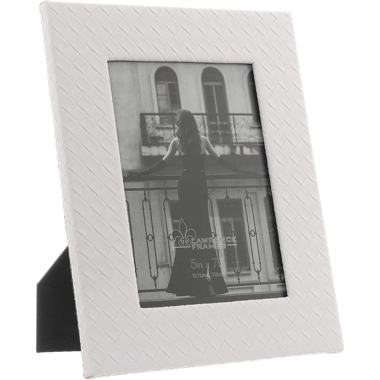 Main view Product Details Lawrence Frames® WOVEN White bonded leather 5x7 frame — Beautifully crafted in white bonded woven pattern leather.Glare resistant glass lens. Easel back for portrait or landscape tabletop display.By Lawrence Frames. WOVEN White bonded leather 5x7 frame Model #751148089371 List $26.00 You pay $20.95 This item IS in stock and can be expected to ship 12/02/2025 Your Price Match is Active Your request for a price of $0.00 for a minimum quantity of has been accepted. You have [time] left to purchase this item for $0.00 instead of $20.95 each. Find a Lower Price? We BEAT All Authorized Retailers [?] Approx. Overall Dimensions:7 5/8"x9 5/8"x3/4" This item ships in its own box SHARE THIS ITEM Share on Facebook