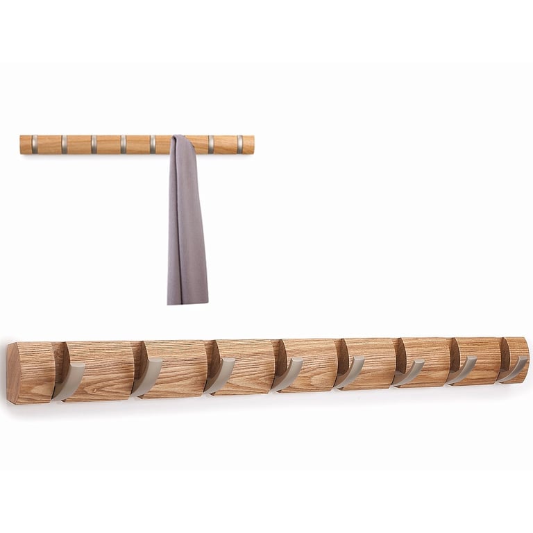 Product Details Umbra® Design The Original FLIP Wood Wall-Mount Rack 8-Hooks in Natural by Umbra® — The FLIP HOOK SERIES by Umbra® The Flip multi-hook rack by Umbra® boasts a clever design: each hook can be flipped up when not in use, slipping neatly into a groove in the rack for a sleek look and space-saving functionality. Constructed of hardwood with brushed nickel-plated hooks, Flip is available in a range of sizes and finishes. This natural-stain wood, eight-hook model measures 32" x 3" x 1". Mounting hardware is included. Designed by David Quan for Umbra® - the worldwide leader in casual, contemporary and affordable design for the home. To view the entire collection, click: Umbra® designs The Original FLIP Wood Wall-Mount Rack 8-Hooks in Natural by Umbra® Model #028295273916 List $65.00 You pay $49.95 In stock Ships next business day [?] Your Price Match is Active Your request for a price of $0.00 for a minimum quantity of has been accepted. You have [time] left to purchase this item for $0.00 instead of $49.95 each. Find a Lower Price? We BEAT All Authorized Retailers [?] FEATURESMaterial:Wood (mdf/engineered)Finish:NaturalOccasion:Business & office, Home decorating, Housewarming, Back to SchoolStyle:Architectural, College Dorm, Contemporary, Minimal, Teens & tweens, Words & whimsyBrand:Umbra® DesignDisplay Type:Wall Only Approx. Overall Dimensions:32"x3"x1" This item ships in its own box SHARE THIS ITEM Share on Facebook