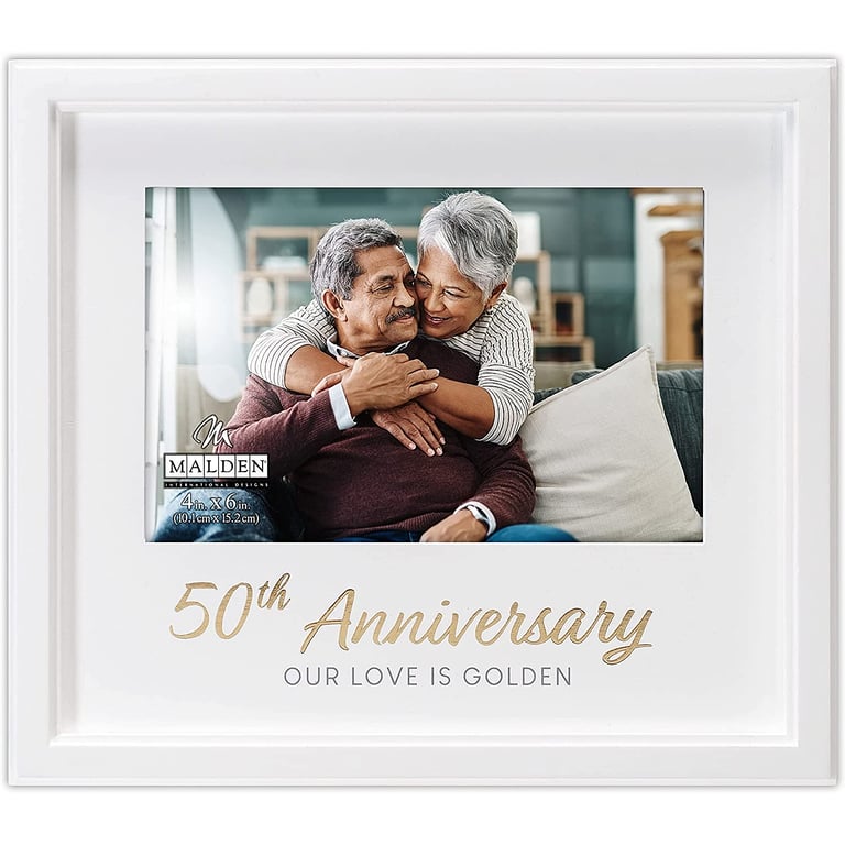 Main view Product Details Malden Designs® 50th Golden Anniversary Special 6x4 frame — Share all the fun of your life with those you love! White engineered wood with golden inscribed sentiment. Glare resistant glass lens. Easel back for desk top display. Wall mounts for easy hanging. By Malden®. 50th Golden Anniversary Special 6x4 frame Model #096287183468 List $18.00 You pay $12.95 In stock Can be shipped today [?] Your Price Match is Active Your request for a price of $0.00 for a minimum quantity of has been accepted. You have [time] left to purchase this item for $0.00 instead of $12.95 each. Find a Lower Price? We BEAT All Authorized Retailers [?] FEATURESDisplays:4"x6"Material:Wood (mdf/engineered)Finish:WhiteOccasion:Anniversary, RomanticStyle:Classic, Romantic, Traditional, Words & whimsy, Sentiments | ready madeOrientation:Horizontal OnlyBrand:Malden Designs®Display Type:Desktop Only Approx. Overall Dimensions:10 1/2"x8 1/2"x1" This item ships in its own box SHARE THIS ITEM Share on Facebook