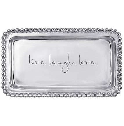 Main view Gift Packaging Product Details Mariposa® LIVE LAUGH LOVE 7in STATEMENT TRAY crafted by Mariposa® — Let this tray serve as a reminder to enjoy life live laugh love. Perfectly sized to fit a check, making this a great way to jazz up a monetary gift. The STATEMENT TRAY was designed by Michael Updike and hand-crafted by Mariposa. SendAFrame stocks the entire Mariposa® picture frame line - and related Brand and Design styled items like this special tray. click: Mariposa® Design Collection Important Note: Mariposa items are hand engraved. Your piece may differ slightly from the photo. LIVE LAUGH LOVE 7in STATEMENT TRAY crafted by Mariposa® Model #808813118611 List $42.00 You pay $38.95 In stock Ships next business day [?] Your Price Match is Active Your request for a price of $0.00 for a minimum quantity of has been accepted. You have [time] left to purchase this item for $0.00 instead of $38.95 each. Find a Lower Price? We BEAT All Authorized Retailers [?] FEATURESMaterial:AluminumFinish:SilverOccasion:Birthday, Congratulations, Corporate gifts, Employee honors, Group Events + Parties, Friendship, Good luck, Graduation, Inspirational, Military Honors, Team & coach gifts, Thank-Motivate-Reward, Valentine`s DayStyle:Contemporary, Romantic, Santa Fe, Shabby Chic, Sports & leisure, Words & whimsy, Eco-Friendly-Recycled, Modern (contemporary) wip, Sentiments | ready made, GlamBrand:Mariposa®Display Type:not applicable n/a Approx. Overall Dimensions:6 3/4"x3 3/4"x1/2" This item ships in its own box SHARE THIS ITEM Share on Facebook