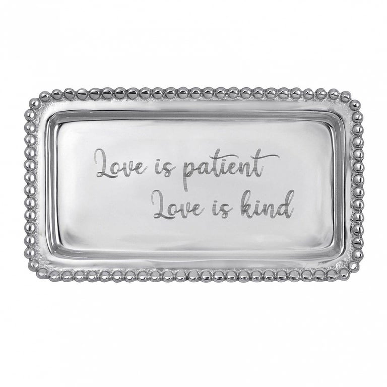 Main view Product Details Mariposa® LOVE IS PATIENT LOVE IS KIND 7in Statement Tray crafted by Mariposa® — Never has a sentiment been so true..."Love is patient Love is kind." Give this handcrafted, engraved tray as a gift to those you love and who love you.Also perfectly sized to fit a check, making this a great way to jazz up a monetary gift. Shop the entire collection: click Mariposa® Design Collection Important Note: Mariposa items are hand engraved. Your piece may differ slightly from the photo. LOVE IS PATIENT LOVE IS KIND 7in Statement Tray crafted by Mariposa® Model #808813178455 List $42.00 You pay $38.95 In stock Ships next business day [?] Your Price Match is Active Your request for a price of $0.00 for a minimum quantity of has been accepted. You have [time] left to purchase this item for $0.00 instead of $38.95 each. Find a Lower Price? We BEAT All Authorized Retailers [?] FEATURESMaterial:AluminumFinish:SilverOccasion:Birthday, Friendship, Inspirational, Military Honors, Valentine`s DayStyle:Contemporary, Romantic, Santa Fe, Shabby Chic, Sports & leisure, Words & whimsy, Eco-Friendly-Recycled, Modern (contemporary) wip, Sentiments | ready made, GlamBrand:Mariposa®Display Type:not applicable n/a Approx. Overall Dimensions:6 3/4"x3 3/4"x1/2" This item ships in its own box SHARE THIS ITEM Share on Facebook