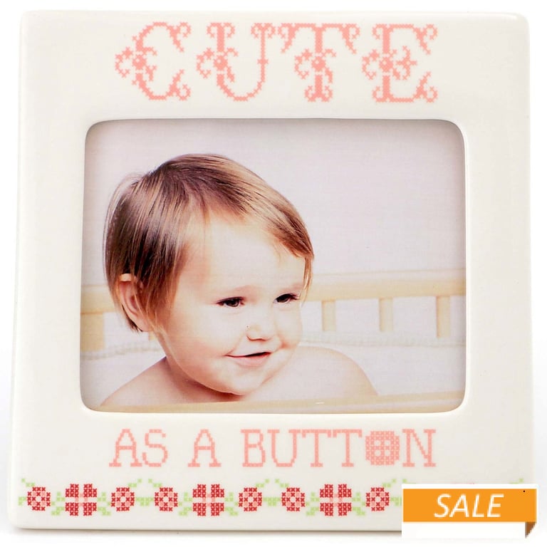 Main view Reverse Gift Box (sample) Product Details Enesco PINK CUTE AS A BUTTON frame by Our Name is Mud® — CUTE AS A BUTTON Cute as a button pink ceramic cross stitch photo frame holds a 5" x4" photo and is giftboxed. A nice addition to any baby girl nursery décor. Makes a great gift for Mothers Day. Glare resistant glass lens. Easel back for horizontal tabletop display. Designed by Lorrie Veasey. Another VERY CUTE frame made by Our Name is Mud®. PINK CUTE AS A BUTTON frame by Our Name is Mud® Model #44924030 List $16.50 You pay $7.90 In stock Ships next business day [?] Your Price Match is Active Your request for a price of $0.00 for a minimum quantity of has been accepted. You have [time] left to purchase this item for $0.00 instead of $7.90 each. Find a Lower Price? We BEAT All Authorized Retailers [?] FEATURESDisplays:4"x5"Material:Acrylic | ResinFinish:PinkOccasion:Baby shower, Mother`s Day, New baby, ChristmasStyle:Child`s play, Words & whimsyOrientation:Horizontal OnlyBrand:EnescoDisplay Type:Desktop Only Approx. Overall Dimensions:6"x6"x3/8" This item ships in its own box SHARE THIS ITEM Share on Facebook
