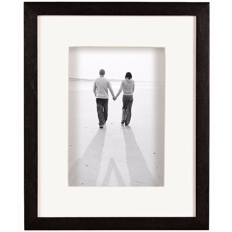 Frame displays an 8"x10" print or piece with its mat; an 11"x14" without mat.