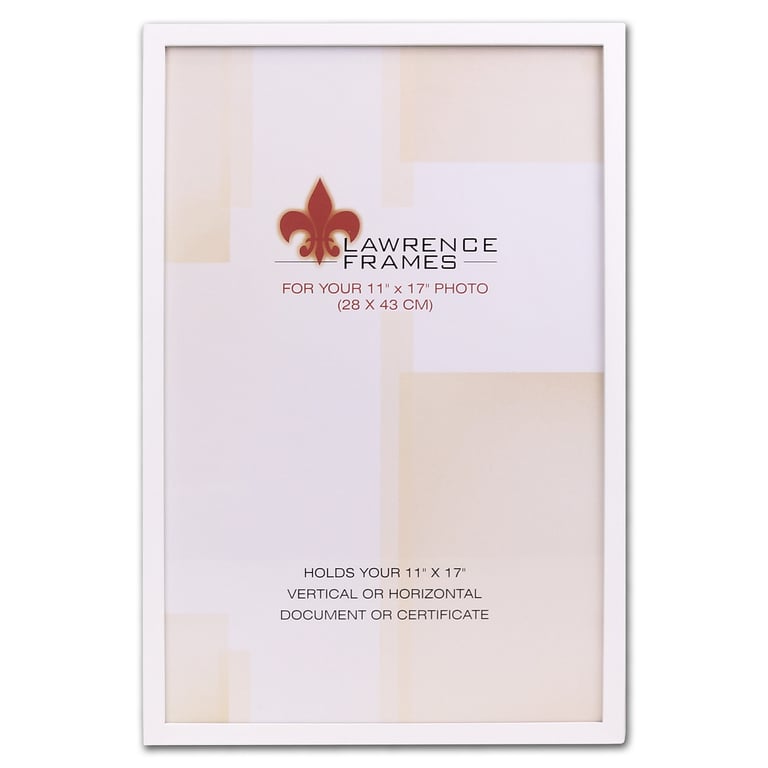 Main view Product Details Lawrence Frames® White square-corner 11x17 frame — Lovely, solid WHITE frame is elegant and an easy style to decorate with.Constructed of matched varnished hardwoods with tailed corners and exact fitting back. Frame edge is a very contemporary ½" all-around.Dual easel for landscape or portrait tabletop use; wall mounting hooks included. Glare resistant glass lens.This is a classic style at a great price. Quality crafted by Lawrence Frames®. White square-corner 11x17 frame Model #751148080859 List $49.00 You pay $40.95 This item is currently out of stock and we do not have an expected date at the present time. click here to be automatically notified when it comes back in stock or email merchandising@sendaframe.com for availability information. You can place this item in your shopping cart. It will be added to the 'saved for later' section. Your Price Match is Active Your request for a price of $0.00 for a minimum quantity of has been accepted. You have [time] left to purchase this item for $0.00 instead of $40.95 each. Find a Lower Price? We BEAT All Authorized Retailers [?] FEATURESDisplays:11"x17"Material:Wood (full grain)Finish:WhiteOccasion:Birthday, Business & office, Congratulations, Craft Projects, Home decorating, Team & coach gifts, Thank-Motivate-RewardStyle:Classic, Architectural, MinimalOrientation:BothBrand:Lawrence Frames®Display Type:Wall Only Approx. Overall Dimensions:11 5/8"x17 5/8"x11/16" This item ships in its own box SHARE THIS ITEM Share on Facebook