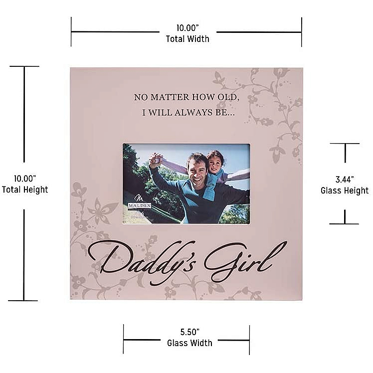 Main view Product Details Malden Designs® DADDY'S GIRL (Lucky Dad!) 6x4 frame — NO MATTER HOW OLD, I WILL ALWAYS BE ... Daddy's Girl Nicely backed with glare resistant glass lens. Stand-up easel for tabletop display or use the included wall mounts for easy hanging.Quality crafted by Malden®. To shop the collection, click Malden Design® DADDY'S GIRL (Lucky Dad!) 6x4 frame Malden Designs® HOLIDAY CELEBRATION Savings - ends SundayBuy More / Save More * Add this item to your cart for the full details of this promotion. Conditions may apply. Model #096287984225 List $14.50 You pay $8.90 In stock Can be shipped today [?] Your Price Match is Active Your request for a price of $0.00 for a minimum quantity of has been accepted. You have [time] left to purchase this item for $0.00 instead of $8.90 each. Find a Lower Price? We BEAT All Authorized Retailers [?] FEATURESDisplays:4"x6"Material:Wood (mdf/engineered)Finish:NaturalOccasion:Father`s Day, Inspirational, Valentine`s DayStyle:Contemporary, Words & whimsy, Sentiments | ready madeOrientation:Horizontal OnlyBrand:Malden Designs® Approx. Overall Dimensions:10 1/2"x10 1/2"x1" This item ships in its own box SHARE THIS ITEM Share on Facebook