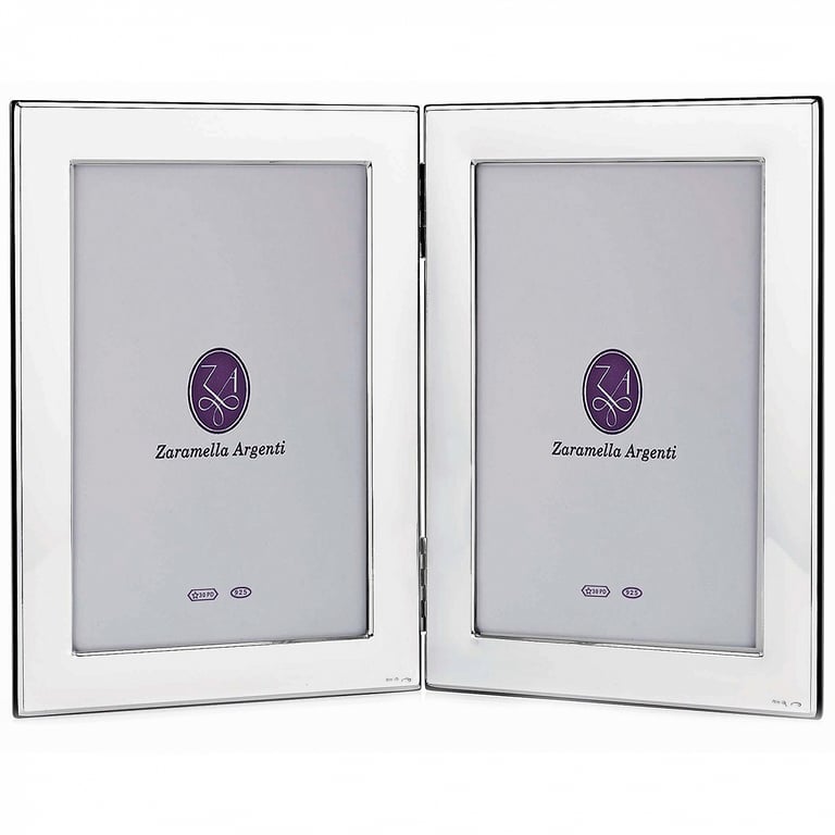 Main view 3-pc Gift Package (sample) Product Details Zaramella Argenti® Luxurious FERRARA engraveable Sterling Silver Double 5x7 by Zaramella Argenti® Italy — This 'hard-to-find' folding hinged duo frame is a natural wedding or newborn gift.A gorgeous sterling silver picture frame, it will be used for prized photos and will surely become a family heirloom.The sterling 13/16" wider channel border engraves beautifully. Click Personalize this item for more details.Zaramella® sterling never needs polishing - it is finely lacquered to keep it tarnish free. Each piece is debossed on front with the ZA family mark, proudly giving signature to the quality this 60 year old company has earned.Crafted in - and imported from - Italy. To view the complete collection, visit: Zaramella Argenti® Collection. Luxurious FERRARA engraveable Sterling Silver Double 5x7 by Zaramella Argenti® Italy Model #17093797 List $425.00 You pay $339.95 This item is currently out of stock and we do not have an expected date at the present time. click here to be automatically notified when it comes back in stock or email merchandising@sendaframe.com for availability information. You can place this item in your shopping cart. It will be added to the 'saved for later' section. Your Price Match is Active Your request for a price of $0.00 for a minimum quantity of has been accepted. You have [time] left to purchase this item for $0.00 instead of $339.95 each. Find a Lower Price? We BEAT All Authorized Retailers [?] FEATURESDisplays:5"x7"Material:Sterling Silver (fine)Finish:SilverOccasion:Anniversary, Bar & Bat Mitzvah, Birthday, Business & office, Congratulations, Good luck, Graduation, Housewarming, Mother`s Day, Retirement, Romantic, Thank-Motivate-Reward, Celebrating Travels, Wedding, Father`s DayStyle:Classic, Contemporary, Minimal, Preppy, Sophisticated, Traditional, RomanticOrientation:Vertical OnlyBrand:Zaramella Argenti®Display Type:Desktop Only This item ships in its own box SHARE THIS ITEM Share on Facebook