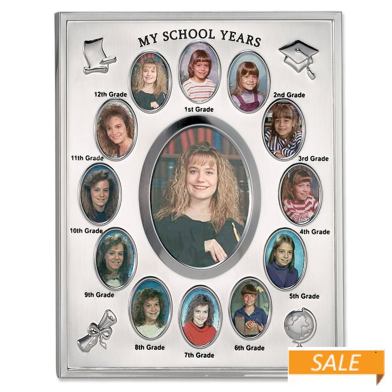 Product Details Lawrence Frames® Turn your student's school photos into a keepsake piece — MY SCHOOL YEARS is a special piece that will become a prized possession with 13 of your child's school photos.Features beautifully articulated school motifs in a quality silverplate piece.At the center of the metallic mat, display your child’s current (or favorite) 3"x4" portrait and surround it with 12 wallet-size photos 1-1/8" x 1-5/8" for grades 1-12, labelled 1st grade through 12th grade. Easel back for table top display - or use the mounting hooks for easy wall hanging.Overall, the frame dimensions are 8“w x 10”h and ½”d.Makes a great gift! Turn your student's school photos into a keepsake piece Model #751148054980 List $42.50 You pay $21.90 This item is no longer available. This popular style was discontinued by the manufacturer as of 04/2025 For suggestions of replacements, see related product links (below) or email service@sendaframe.com. Your Price Match is Active Your request for a price of $0.00 for a minimum quantity of has been accepted. You have [time] left to purchase this item for $0.00 instead of $21.90 each. Find a Lower Price? We BEAT All Authorized Retailers [?] FEATURESDisplays:2"x3"Material:SilverplateFinish:SilverStyle:Child`s play, Classic, Contemporary, TraditionalOrientation:Vertical OnlyBrand:Lawrence Frames®Display Type:Desktop or Wall Approx. Overall Dimensions:8"x10"x1/2" This item ships in its own box SHARE THIS ITEM Share on Facebook