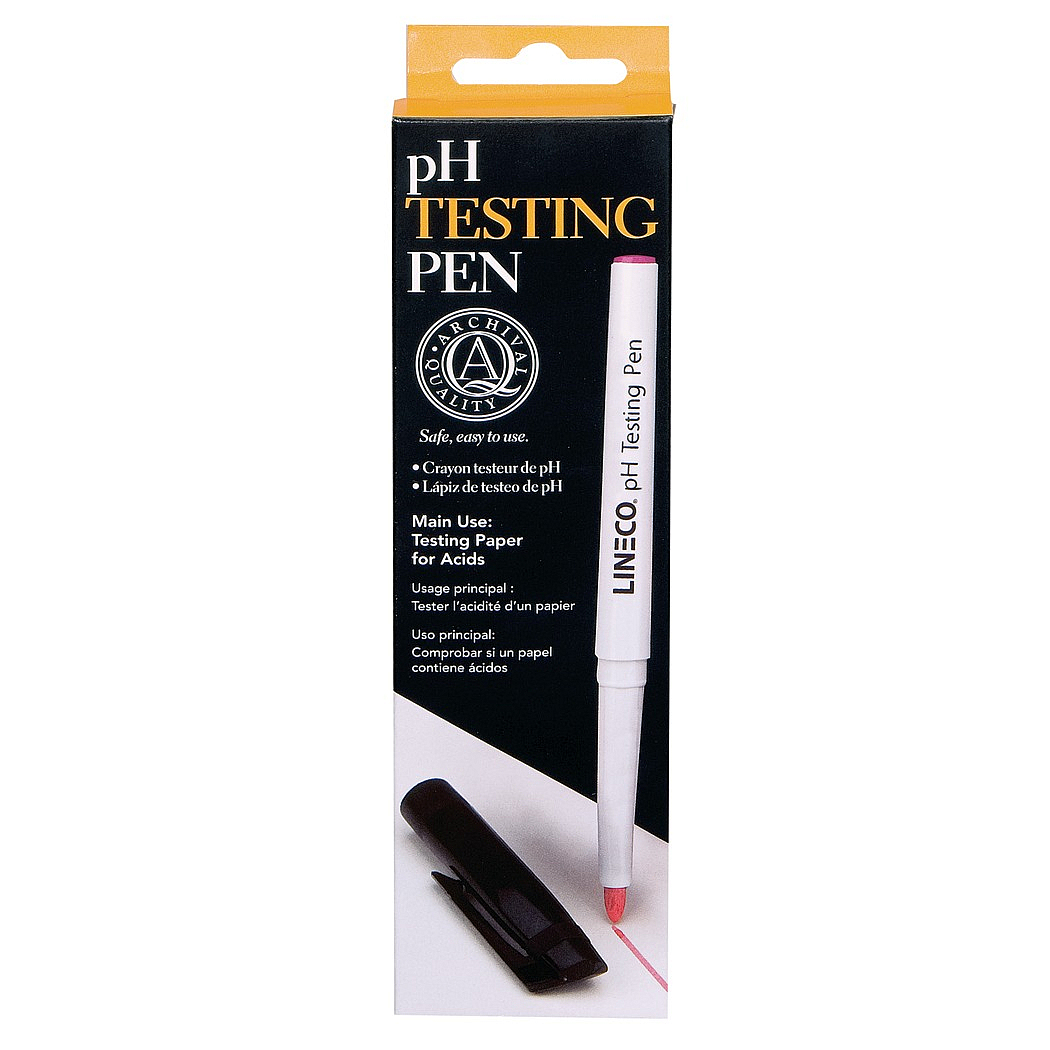 This easy, convenient method allows you to check the difference between safe (neutral or alkaline) and acidic materials. Easy to use: simply draw a small line on the material you wish to test. The chlorophenol red indicator solution in the pen will turn purple on any paper with a pH of 6.8 and above. A clear or yellow color indicates the material is probably unsuitable for conservation purposes.