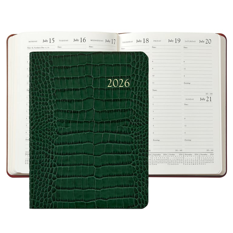 Main view Product Details Graphic Image® 2026 8in CROCO EMERALD-GREEN Daily Journal Leather by Graphic Image™ — The 8-inch planner is a journal and diary in one, offering day-at-a-view appointment pages. Also included in this 416 page book are calendar, appointment and resource pages. Size: 5½x8", 416 pages Luxe croco-embossed full-grain leather Week and Day-at-a-view pages Smyth sewn for strength and longevity Cream-white, acid-free paper with gold gilt edges Date is pre-stamped in gold Personalization is available - click the link Personalize This Item Individually bench-crafted in America Makes a great corporate gift. click the link Request A Quote for quantity pricing. Calendar & appointment pages include: Previous, current and next year's calendars Month-at-a-View appointment pages Next-year-planning pages Includes information pages on: U.S. and International holidays Personal birthday and anniversary record Gifts appropriate for selected anniversaries Zodiac dates and symbols Birthstone and flower for each month Personal expense summary Personal telephone directory U.S. and Canadian area codes, International dialing codes Toll-free numbers for airlines, railroads, car rentals, courier services, lost credit cards, hotels, motels, and resorts United States and International road and air distances United States and International weather World Times Zones International travel information Currency exchange rates Foreign embassies in the United States Weight and measure equivalents and conversion By the Graphic Image® Company. To view the complete collections, click: Graphic Image® photo albums and books.. 2026 8in CROCO EMERALD-GREEN Daily Journal Leather by Graphic Image™ Model #611959774517 $130.00 This item IS in stock and can be expected to ship 02/05/2026 Your Price Match is Active Your request for a price of $0.00 for a minimum quantity of has been accepted. You have [time] left to purchase this item for $0.00 instead of $130.00 each. Find a Lower Price? We BEAT All Authorized Retailers [?] FEATURESDisplays:5.50"x8"Material:Leather (fine)Finish:GreenOccasion:Back to School, Business & office, Christmas, Corporate gifts, Employee honors, Friendship, Good luck, Graduation, Hanukkah, Thank-Motivate-RewardStyle:Classic, Traditional, Sophisticated, ContemporaryBrand:Graphic Image®Display Type:not applicable n/a Approx. Overall Dimensions:5 1/2"x8" This item ships in its own box SHARE THIS ITEM Share on Facebook