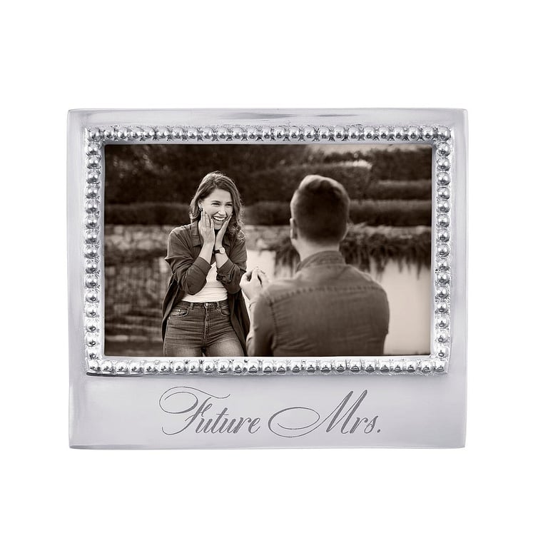 Main view Engraves beautiful with text/graphics of your choosing Personalize Gifts for every occasion Product Details Mariposa® FUTURE MRS. Statement frame crafted by Mariposa® — Here, the FUTURE MRS. Statement frame for 6"x4" photos. SendAFrame stocks the entire Mariposa® picture frame collection. To start - or add to your collection, click: Mariposa® Design Collection Important Note: Mariposa items are hand engraved. Your piece may differ slightly from the photo. FeaturesImportant Note: Mariposa items are hand engraved. Your piece may differ slightly from the photo. FUTURE MRS. Statement frame crafted by Mariposa® Mariposa® FALL CELEBRATION Savings - Buy More / Save More * Add this item to your cart for the full details of this promotion. Conditions may apply. Model #13199153 $56.00 only 5 left, order soon. In stock Can be shipped today [?] Your Price Match is Active Your request for a price of $0.00 for a minimum quantity of has been accepted. You have [time] left to purchase this item for $0.00 instead of $56.00 each. Find a Lower Price? We BEAT All Authorized Retailers [?] FEATURESDisplays:4"x6"Material:AluminumFinish:SilverOccasion:Engagement, WeddingStyle:Contemporary, Santa Fe, Sophisticated, Words & whimsy, Eco-Friendly-Recycled, Modern, Expressions > ready madeOrientation:Horizontal OnlyBrand:Mariposa®Display Type:Desktop Only Approx. Overall Dimensions:6 3/4"x5 3/4"x1" This item ships in its own box SHARE THIS ITEM Share on Facebook