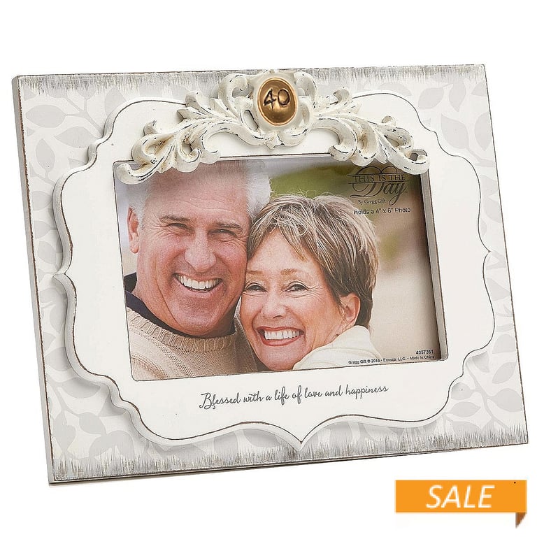 Main view Product Details Enesco Celebrate a 40th Anniversary with this special frame — 40 YEARS Blessed with a life of love and happiness This Blessed with a life of love and happiness frame is designed with a whitewashed wood-look with & silver leaf patterned background. An antiqued molded scroll has a copper 40th cabochon at the center and holds a 4”x6” photo. Designed by Kim Lawrence. Made by Enesco®, the special occasion gift people. Celebrate a 40th Anniversary with this special frame Model #44911436 List $17.95 You pay $8.90 In stock Ships next business day [?] Your Price Match is Active Your request for a price of $0.00 for a minimum quantity of has been accepted. You have [time] left to purchase this item for $0.00 instead of $8.90 each. Find a Lower Price? We BEAT All Authorized Retailers [?] FEATURESDisplays:4"x6"Material:Wood (mdf/engineered)Finish:Silver, WhiteOccasion:AnniversaryStyle:Classic, Contemporary, Traditional, Words & whimsy, Expressions > ready madeOrientation:Horizontal OnlyBrand:EnescoDisplay Type:Desktop Only Approx. Overall Dimensions:8 1/2"x6 3/4"x3/8" This item ships in its own box SHARE THIS ITEM Share on Facebook
