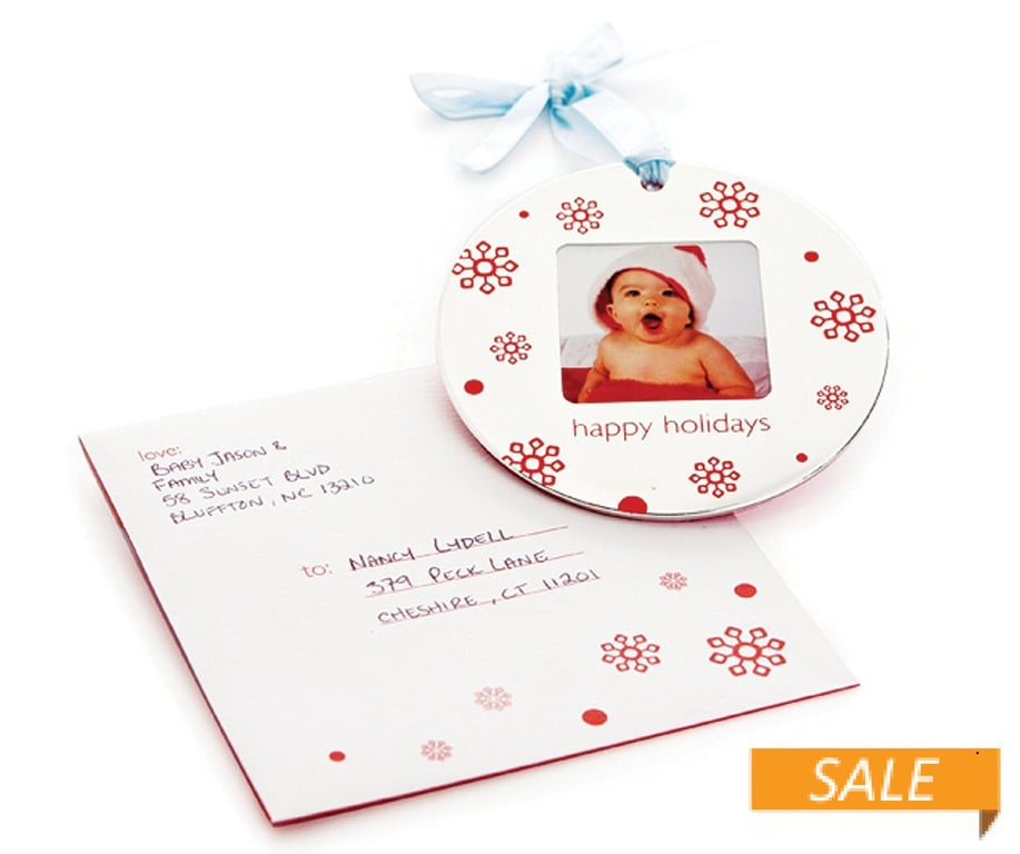 Product Details Pearhead Christmas Photo Mail-An-Ornament by Babyprints® — Show off your little one with a special Christmas photo tree ornament.You simply "pop" your favorite photo into the lightweight aluminum piece.Ornament includes a matching envelope for mailing to your loved ones. To view the Babyprints® complete collection, visit: Babyprints®. SendAFrame fully stocks, factory fresh, the entire Babyprints line for your shopping convenience. Christmas Photo Mail-An-Ornament by Babyprints® Model #698904510109 List $7.00 You pay $3.90 In stock Can be shipped today [?] Your Price Match is Active Your request for a price of $0.00 for a minimum quantity of has been accepted. You have [time] left to purchase this item for $0.00 instead of $3.90 each. Find a Lower Price? We BEAT All Authorized Retailers [?] FEATURESDisplays:4"x6"Material:AluminumFinish:Red, WhiteOccasion:Baby shower, Christmas, New babyStyle:Contemporary, Preppy, Words & whimsyOrientation:BothBrand:PearheadDisplay Type:not applicable n/a This item ships in its own box SHARE THIS ITEM Share on Facebook