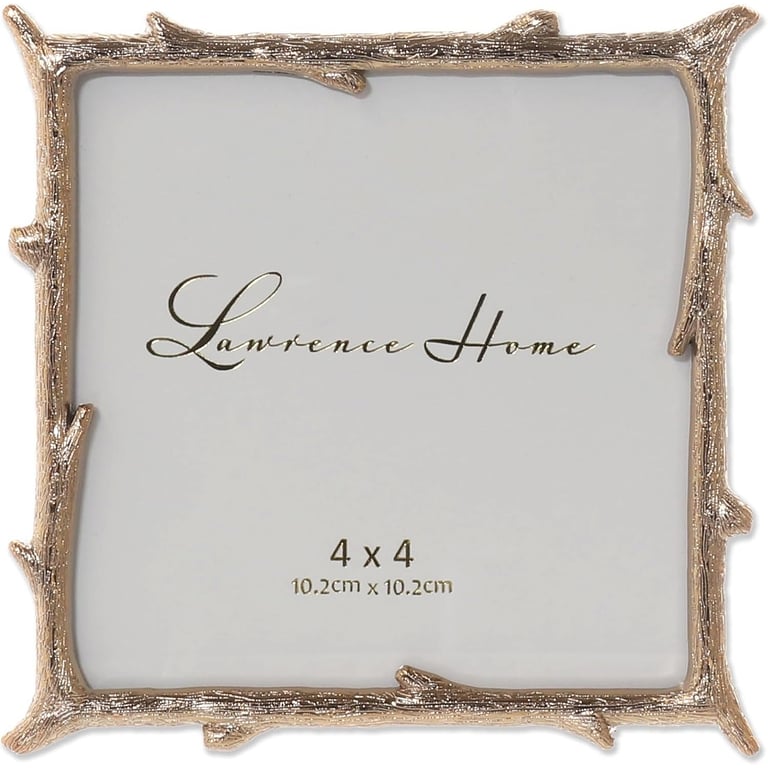 Main view Product Details Lawrence Frames® Golden BRANCHES 4x4 by Lawrence — Gold plate frame, nicely crafted with an eclectic branch style trim.Attractively velvet backed for wonderful desk appeal. Easel back for tabletop display. Wall mount for easy hanging. Glare resistant glass lens.By Lawrence®. Golden BRANCHES 4x4 by Lawrence Model #751148090681 List $24.00 You pay $18.95 This item IS in stock and can be expected to ship 02/04/2026 Your Price Match is Active Your request for a price of $0.00 for a minimum quantity of has been accepted. You have [time] left to purchase this item for $0.00 instead of $18.95 each. Find a Lower Price? We BEAT All Authorized Retailers [?] FEATURESDisplays:4"x4"Material:Gold plateFinish:GoldOccasion:Anniversary, Birthday, Business & office, Corporate gifts, Engagement, Friendship, Good luck, Home decorating, Weekend Host Gifts, Housewarming, Mother`s Day, Retirement, Thank-Motivate-Reward, WeddingStyle:Asian Zen, Classic, TraditionalBrand:Lawrence Frames®Display Type:Desktop or Wall Approx. Overall Dimensions:5"x5"x11/16" This item ships in its own box SHARE THIS ITEM Share on Facebook