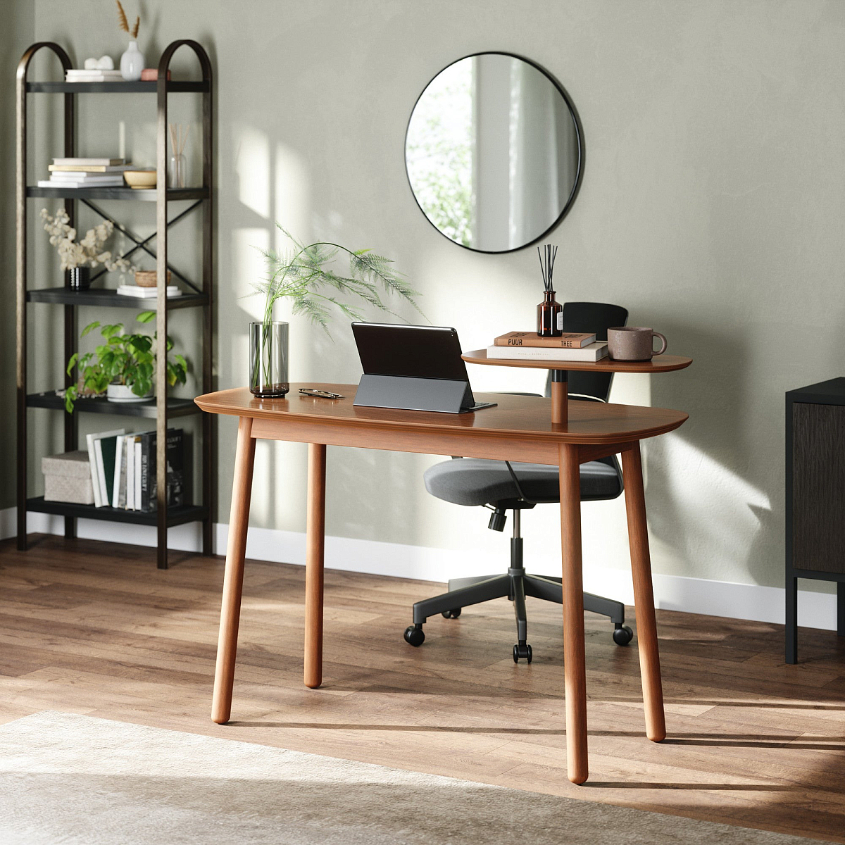 Main view Product Details Umbra® Design The SWIVO DESK Beechwood Light-Walnut by Umbra® — A minimalist and natural-finish desk, Swivo features a swivelling top tier, providing space for a small plant, books, drinks and more. Incorporating real wood and soft curves, this desk adds a subtle modern touch to your work space. Part of Umbra's Swivo Collection which features a coffee and side table. Versatile, Modern Desk: Swivo Desk is a modern and versatile desk with a real wood finish, soft curves and a swivelling top tier Swivelling Top-Tier: Swivo's top tier swivels for easy access to plants, remotes, snacks, and more Soft Edges - No Sharp Corners: With no sharp corners, Swivo adds a soft, modern touch to any living space Real Wood Finish: Made of natural wood and metal, Swivo was inspired by soft natural shapes, creating a minimalist and modern pattern that is easy on the eye Easy to assemble: Swivo Desk comes with all necessary hardware and instructions for a quick assembly. Designed by EUGÉNIE DE LOYNES for Umbra® - the worldwide leader in innovative, modern, casual and affordable design for the home. To view the entire collection, click: Umbra® designs The SWIVO DESK Beechwood Light-Walnut by Umbra® Model #95379755 $475.00 only 1 left, order soon. In stock Ships next business day Your Price Match is Active Your request for a price of $0.00 for a minimum quantity of has been accepted. You have [time] left to purchase this item for $0.00 instead of $475.00 each. Find a Lower Price? We BEAT All Authorized Retailers [?] FEATURESMaterial:Wood (full grain)Finish:Brown, Brown(Light)/TanOccasion:Business & office, Home decorating, Back to SchoolStyle:Architectural, Contemporary, Minimal, ScandinavianBrand:Umbra® DesignDisplay Type:not applicable n/a Approx. Overall Dimensions:50"x35 1/2"x22" This item ships in its own box SHARE THIS ITEM Share on Facebook