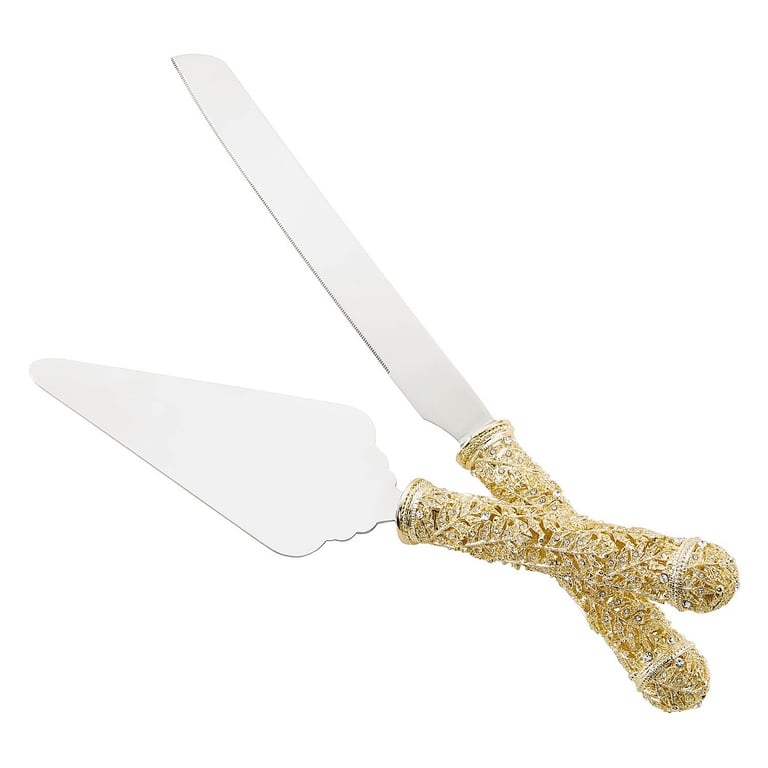 Main view Product Details Olivia Riegel FLORENCE GOLD VERMEIL DESSERT SERVING SET by Olivia Riegel® — Gold finished pewter acanthus leaf patterned handles, richly encrusted with hand-set clear European crystals. Engravable stainless steel blades. Tarnish resistant. Hand-wash. Signature luxury gift box included. Knife: 13.5”L x 1”W Server: 11”L x 2.75”W An original design from the Olivia Riegel® collection. FeaturesKnife: 13.5”L x 1”W Server: 11”L x 2.75”W FLORENCE GOLD VERMEIL DESSERT SERVING SET by Olivia Riegel® OLIVIA RIEGEL® FALL CELEBRATION SAVINGS - Buy More / Save More * Add this item to your cart for the full details of this promotion. Conditions may apply. Model #851090000407 $250.00 This item IS in stock and can be expected to ship 11/25/2025 Your Price Match is Active Your request for a price of $0.00 for a minimum quantity of has been accepted. You have [time] left to purchase this item for $0.00 instead of $250.00 each. Find a Lower Price? We BEAT All Authorized Retailers [?] FEATURESMaterial:Jewels/crystalFinish:GoldOccasion:Anniversary, Engagement, Friendship, Home decorating, Housewarming, Wedding, Birthday, HanukkahStyle:Ornate, TraditionalBrand:Olivia RiegelDisplay Type:not applicable n/a This item ships in its own box SHARE THIS ITEM Share on Facebook