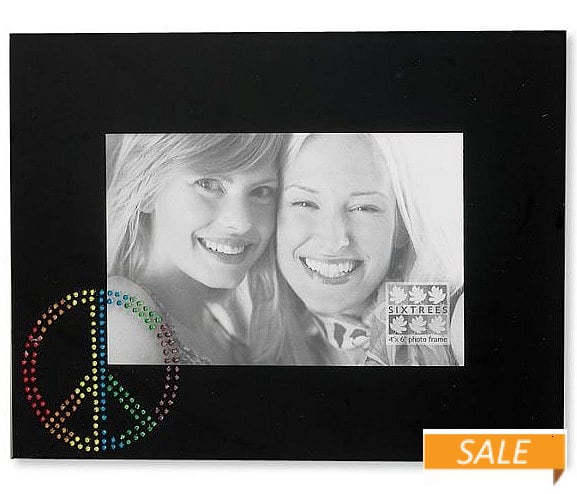 Product Details SIXTREES® GLASS Expressions PEACE on black by Sixtrees® — PEACE Special bevelled black glass with set rainbow colored rhinestones creates a fun piece to be cherished!Nice hardboard backing for tabletop display. Glare resistant glass lens.Crafted by Sixtrees®. GLASS Expressions PEACE on black by Sixtrees® Model #783729161046 List $16.00 You pay $6.19 In stock Can be shipped today [?] Your Price Match is Active Your request for a price of $0.00 for a minimum quantity of has been accepted. You have [time] left to purchase this item for $0.00 instead of $6.19 each. Find a Lower Price? We BEAT All Authorized Retailers [?] FEATURESDisplays:4"x6"Material:GlassOccasion:Birthday, Group Events + Parties, Friendship, Sweet 16Style:Contemporary, Pop Culture, Sports & leisure, Teens & tweens, Words & whimsy, College Dorm, Sentiments | ready madeOrientation:Horizontal OnlyBrand:SIXTREES®Display Type:Desktop Only This item ships in its own box SHARE THIS ITEM Share on Facebook