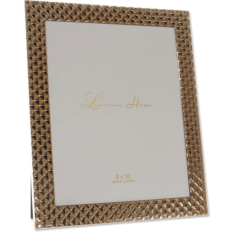 Main view Product Details Lawrence Frames® DIAMOND PATTERN polished goldplate 8x10 frame — High polished diamond pattern goldplate style is a blend of Italian & contemporary look.Slide-in channel back black velvet. Dual easel back for either portrait or landscape tabletop display. Wall mounts included for easy hanging. Glare resistant glass lens. By Lawrence® DIAMOND PATTERN polished goldplate 8x10 frame Model #751148089432 List $32.00 You pay $24.95 This item IS in stock and can be expected to ship 12/02/2025 Your Price Match is Active Your request for a price of $0.00 for a minimum quantity of has been accepted. You have [time] left to purchase this item for $0.00 instead of $24.95 each. Find a Lower Price? We BEAT All Authorized Retailers [?] This item ships in its own box SHARE THIS ITEM Share on Facebook