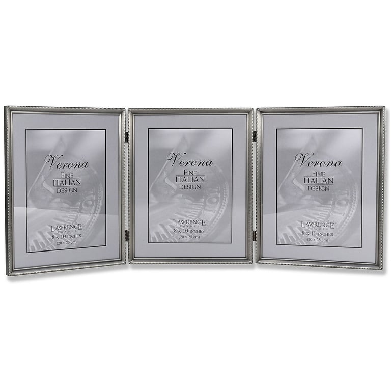 Main view Product Details Lawrence Frames® Satin Antiqued Pewter Hinged 8x10 Triple w/caviar bead trim — Beaded antiqued pewter frame is nicely crafted with invisible seams and corners.Attractively backed for wonderful desk appeal. Glare resistant glass lenses. Edge measures 3/8" wide all around.Crafted by Lawrence Frames®. Satin Antiqued Pewter Hinged 8x10 Triple w/caviar bead trim Model #751148065283 List $80.00 You pay $56.95 In stock Ships next business day [?] Your Price Match is Active Your request for a price of $0.00 for a minimum quantity of has been accepted. You have [time] left to purchase this item for $0.00 instead of $56.95 each. Find a Lower Price? We BEAT All Authorized Retailers [?] FEATURESDisplays:8"x10"Material:Pewter (plate)Finish:SilverOccasion:Anniversary, Birthday, Good luck, Graduation, Mother`s Day, Retirement, Romantic, Thank-Motivate-Reward, Celebrating Travels, WeddingStyle:Antique, Classic, Traditional, RomanticOrientation:Vertical OnlyBrand:Lawrence Frames®Display Type:Desktop or Wall This item ships in its own box SHARE THIS ITEM Share on Facebook