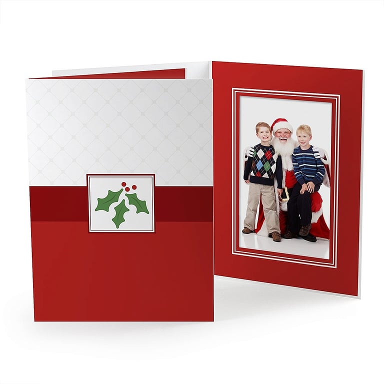 Use for breakfast with Santa or mall Santa photos, school events, holiday promotions and other special events. HOLIDAY HOLLY photo folders are the perfect accompaniment to event photography with a holiday theme. Optional personalization allows you to add your business or event name, logo, date and more.