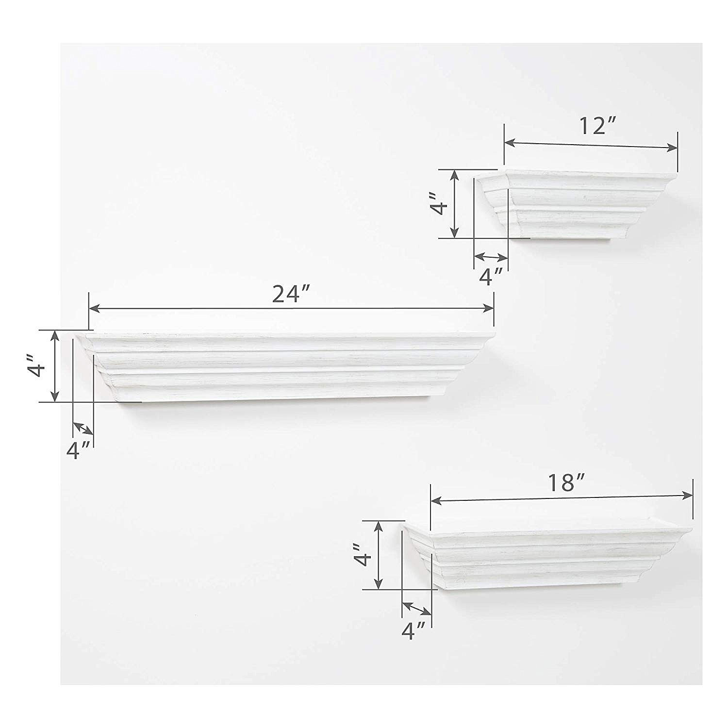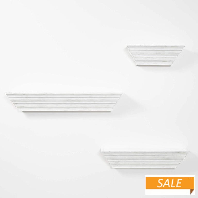 Main view Keyhole mounting (sample) Product Details Gallery Solutions™ DISTRESSED FLOATING WHITE GALLERY 12in/18in/24in SHELVES by Gallery Solutions® (set of 3) — Display cherished photos, art work and other small collectibles on fine crafted shelves by Gallery Solutions.Use to create a gallery effect in your home. This is a set of 3 ledges in total: 12" + 18" + 24" - 1 piece each Gallery Solutions® distressed white classic ledges are a great addition to any gallery For home or business Sturdy construction with hardware included Easy to mount "keyhole" back - you drop each ledge onto the wall screws (provided) Gallery Solutions® is a division of Nielsen®, the World's Leading frame and photo presentation manufacturer. DISTRESSED FLOATING WHITE GALLERY 12in/18in/24in SHELVES by Gallery Solutions® (set of 3) Model #038555551906 List $85.00 You pay $44.90 This item IS in stock and can be expected to ship 01/27/2026 In stock Your Price Match is Active Your request for a price of $0.00 for a minimum quantity of has been accepted. You have [time] left to purchase this item for $0.00 instead of $44.90 each. Find a Lower Price? We BEAT All Authorized Retailers [?] FEATURESMaterial:Wood (full grain)Finish:WhiteOccasion:Business & office, Home decoratingStyle:Architectural, Classic, Contemporary, TraditionalBrand:Gallery Solutions™Display Type:not applicable n/a Approx. Overall Dimensions:12"x4"x4" This item ships in its own box SHARE THIS ITEM Share on Facebook