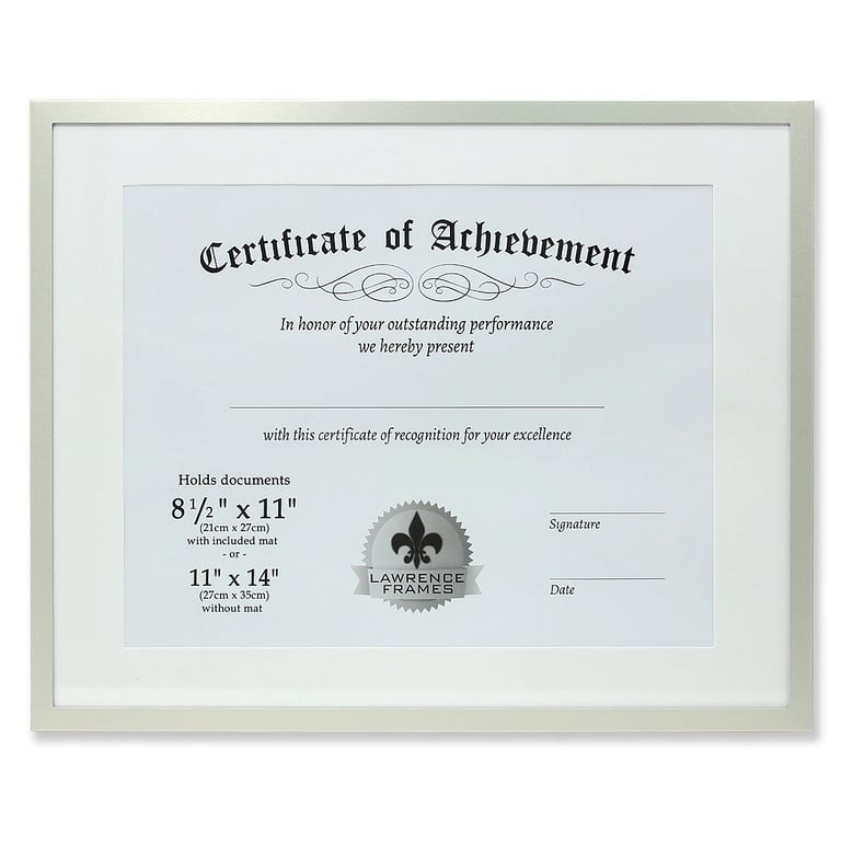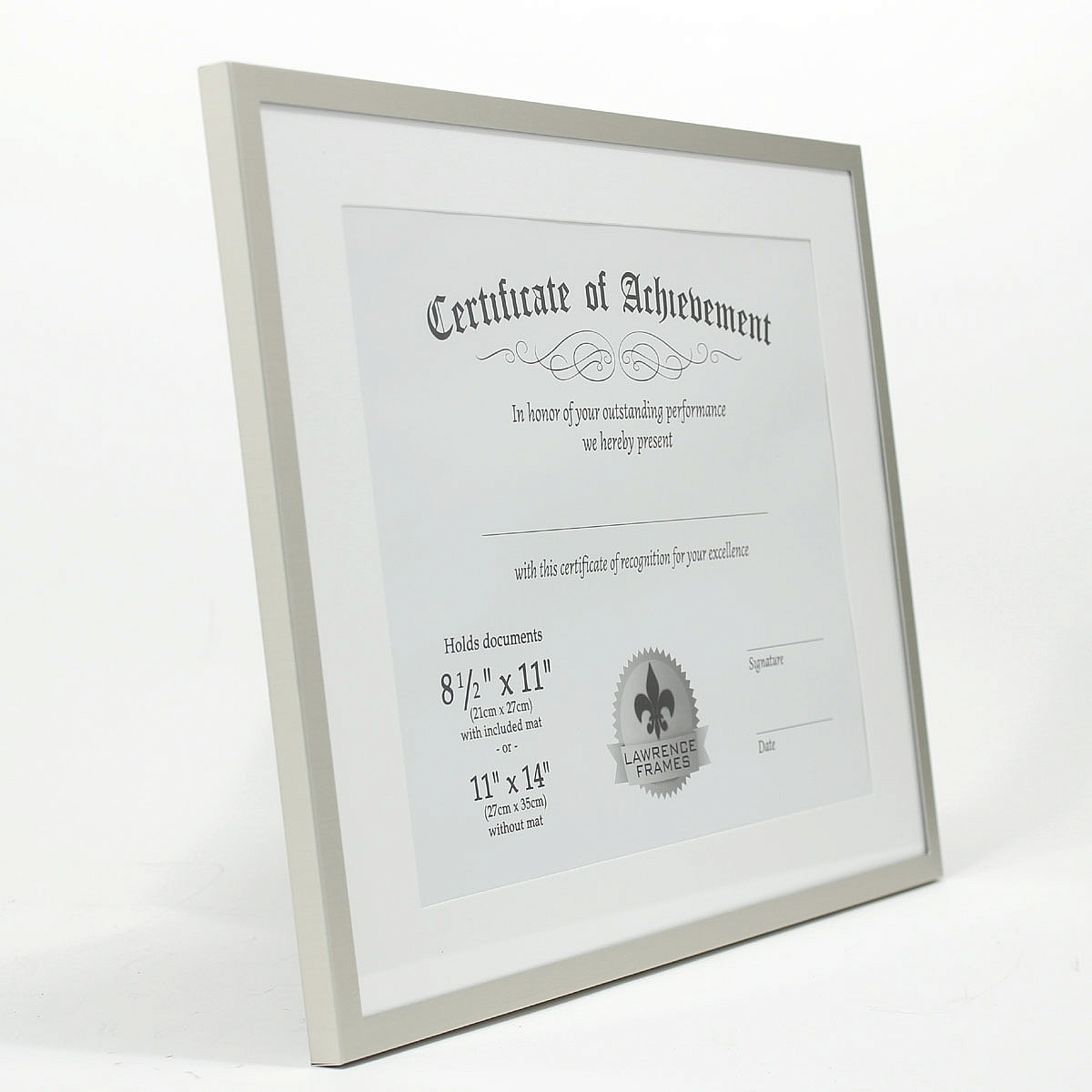Main view Product Details Lawrence Frames® Certificate-size Brushed-Silver Aluminum 14x11/11x8½ frame — Contemporary brushed silver aluminum finish in an exceptional square corner design. Displays an 11"x8½" with its coordinated mat; a 14"x11" without mat.A gallery quality display for home or office. Easy wall mounts included on the frame. Glare resistant glass lens. By Lawrence Frames®. Certificate-size Brushed-Silver Aluminum 14x11/11x8½ frame Model #751148067935 List $28.50 You pay $19.95 In stock Ships next business day [?] Your Price Match is Active Your request for a price of $0.00 for a minimum quantity of has been accepted. You have [time] left to purchase this item for $0.00 instead of $19.95 each. Find a Lower Price? We BEAT All Authorized Retailers [?] This item ships in its own box SHARE THIS ITEM Share on Facebook