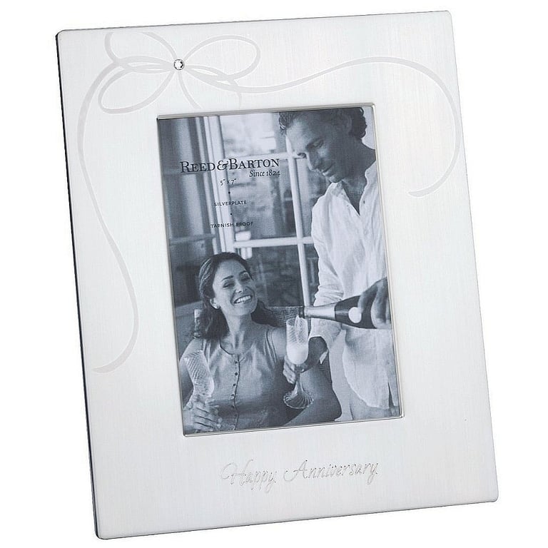 Product Details Reed & Barton Reed & Barton® HAPPY ANNIVERSARY collection silver picture frame — Simple elegance aptly describes this new Reed & Barton® silverplated Anniversary frame.More a room accessory than a frame, the clean lines and a brilliant, wide border make this frame a must-have. Etched in a pretty script across the bottom is the phrase “Happy Anniversary,” while a slender knotted ribbon with a bejeweled center adorns the upper half.The style has a beautiful easel black velvet back for portrait display.Silver is invisibly lacquer treated to be tarnish proof, with a 100-year guarantee. To view the complete collection, click: Reed & Barton® Collection Reed & Barton® HAPPY ANNIVERSARY collection silver picture frame Model #735092213006 List $45.00 You pay $36.95 In stock Can be shipped today [?] Your Price Match is Active Your request for a price of $0.00 for a minimum quantity of has been accepted. You have [time] left to purchase this item for $0.00 instead of $36.95 each. Find a Lower Price? We BEAT All Authorized Retailers [?] This item ships in its own box SHARE THIS ITEM Share on Facebook