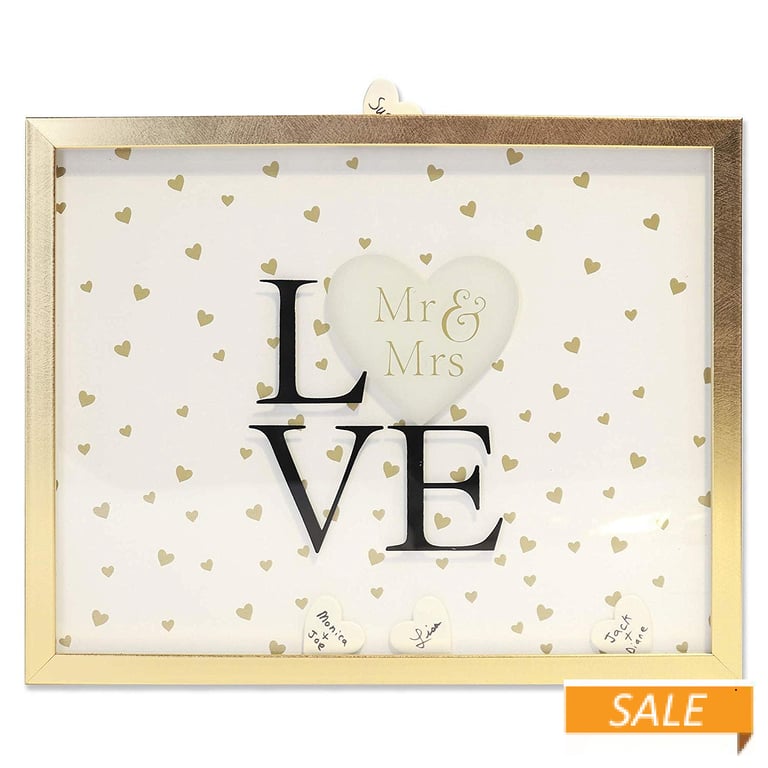 Shadow Box features a slot at the top of the shadow box where a signed heart can be dropped. Printed on the glass cover are the words "Mr. and Mrs. and Love".