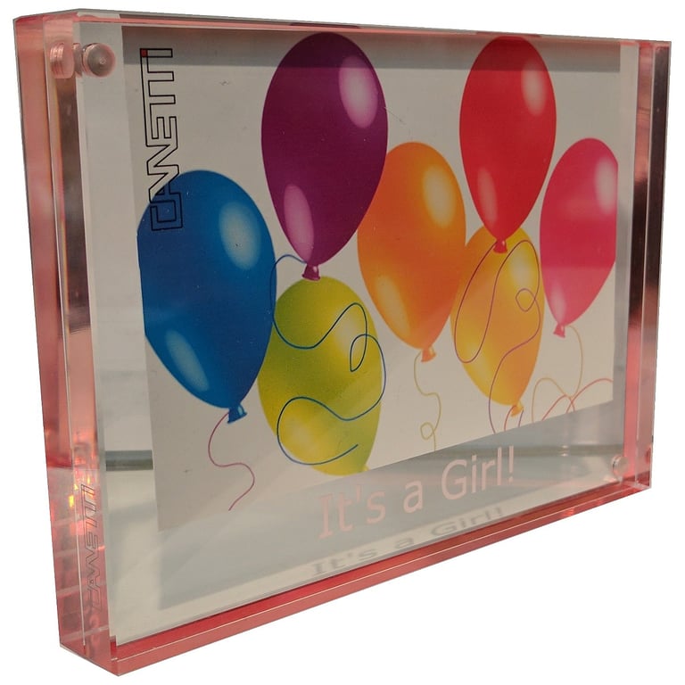 Main view Catalog Photo Product Details Canetti Design® ITS A GIRL! The MAGNET 5x7 FRAME by Canetti® — The original MUSEUM MAGNET FRAME by Canetti Design® etched with It's a Girl! - for an easy baby to give gift. Luxe quality "Magnet" is the original desk piece - made in ultra-clear virgin acrylic and featured in the Museum of Modern Art in NYC (MoMA). Your print will appear to float in borderless space, as if suspended in air. That's the power of this wonderful desk frame. Super strong pill-sized magnets securely and firmly sandwich your photo or single sheet print for this wonderful effect. Displays 2 prints - back and front.The acrylic is 7/8" thick and luscious to the touch. Designed by Nicolai Canetti, 1994. To shop the entire line, click Canetti Museum Frames. ITS A GIRL! The MAGNET 5x7 FRAME by Canetti® Model #756100475056 List $39.00 You pay $35.95 In stock Can be shipped today [?] Your Price Match is Active Your request for a price of $0.00 for a minimum quantity of has been accepted. You have [time] left to purchase this item for $0.00 instead of $35.95 each. Find a Lower Price? We BEAT All Authorized Retailers [?] Approx. Overall Dimensions:7"x5"x7/8" This item ships in its own box SHARE THIS ITEM Share on Facebook